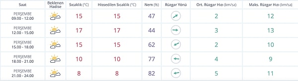 Saat 06.00-12.00 arası sıcaklık 15 derece olacak. 12.00’dan itibaren sıcaklık 17 dereceye ulaşacak. Saat 15.00’a kadar 17 derecede seyreden hava sıcaklığı kademeli olarak düşecek. En düşük sıcaklık ise saat 21.00-24.00 arası olacak. Bu saatler arasında hava sıcaklığı 8 dereceye kadar düşecek.