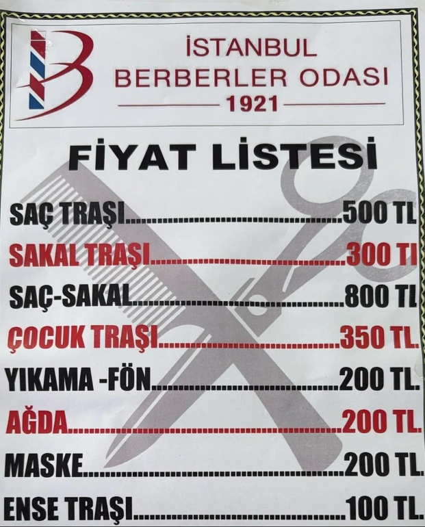 Çocuk tıraşı ücreti ise 350 TL’ye çıkarıldı. Ayrıca, yıkama-fön 200 TL, ağda 200 TL ve maske uygulaması 200 TL olarak tarifede yerini aldı. Ense tıraşı ücreti ise 100 TL olarak güncellendi.