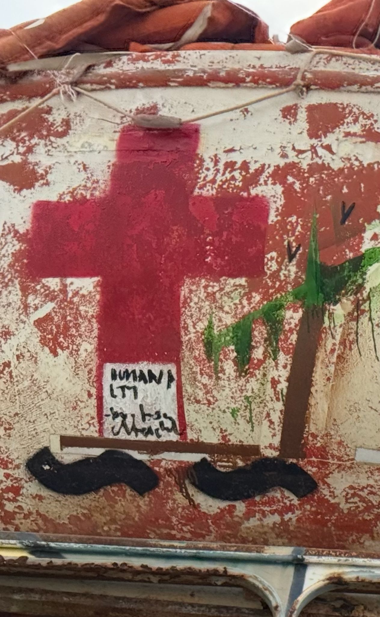 Eserde yer alan Kızıl Hac sembolü, Filistin’de İsrail’in hastanelere düzenlediği saldıraları sembolize ediyor. Sanatçı, Uluslararası sözleşmelerce Kızıl haç sembolünün olduğu kişi ve araçlara bile saldırı düzenlemenin yasak olmasına rağmen İsrail’in hastaneleri “mezarlara” çevirmesine tepki gösteriyor.