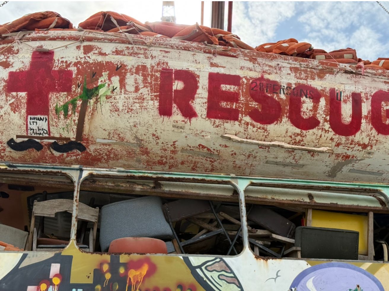 Siyah renkte “ ~ ~ “ işareti ve “Rescue Boat”