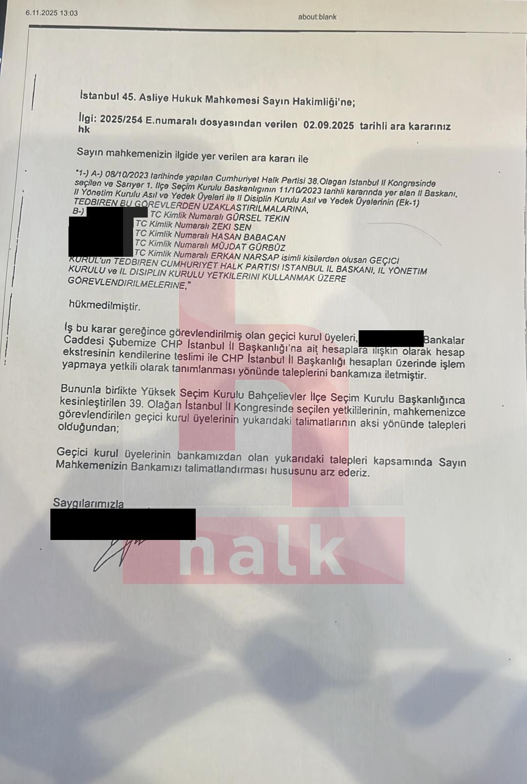 Banka tarafından İstanbul 45. Asliye Hukuk Mahkemesine gönderilen ‘talimatlandırma’ dilekçesi