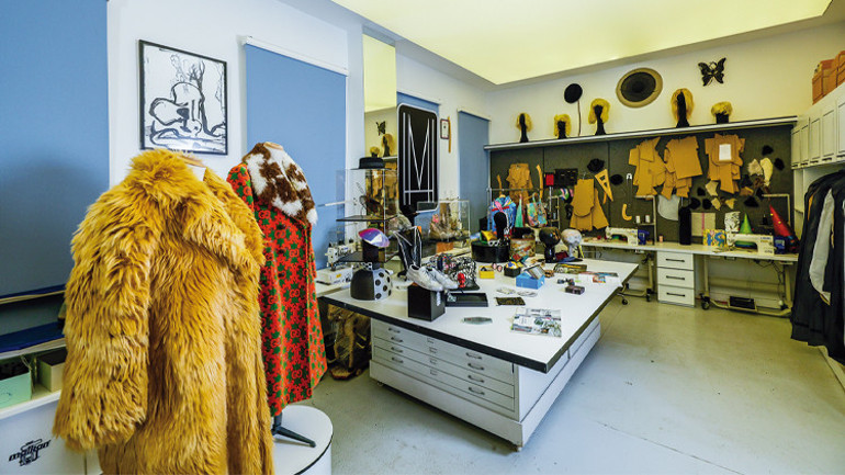 İkinci katta sanatçının terzihanesi var. Üzerinde gördüğümüz ‘çılgın’ kıyafetlerin birçoğu burada yapılmış. Duvarda çıkardığı kalıplar asılı. Askıda tişörtleri, paltoları… Songül Hanım eline bir ceket alıp başlıyor anlatmaya: “Bu ceketi kim bilir kaç kez boyadı, inanın hatırlamıyorum. Yine bir gün bu ceketi boyayıp giymiş. Boynu dikkatimi çekti. ‘Ne yaptın boynuna’ diye sorduğumda ceketin içine istediği renkte giyecek bir şey bulamayınca boynunu boyadığını söyledi.”