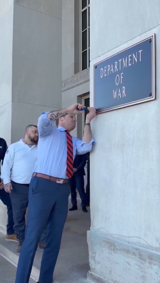Bakanlığın sosyal medya hesaplarında paylaşılan görüntülerde, ABD Savunma Bakanı Pete Hegseth’in “Savaş Bakanlığı” yazılı bronz levhalardan birini bizzat vidaladığı görüldü. Hegseth, “Eski tabelaları değiştirmek istedik çünkü bu kapıdan giren herkesin, bu kuruluşun isminin değiştirilmesi konusunda son derece ciddi olduğumuzu bilmesini istiyoruz.” dedi.